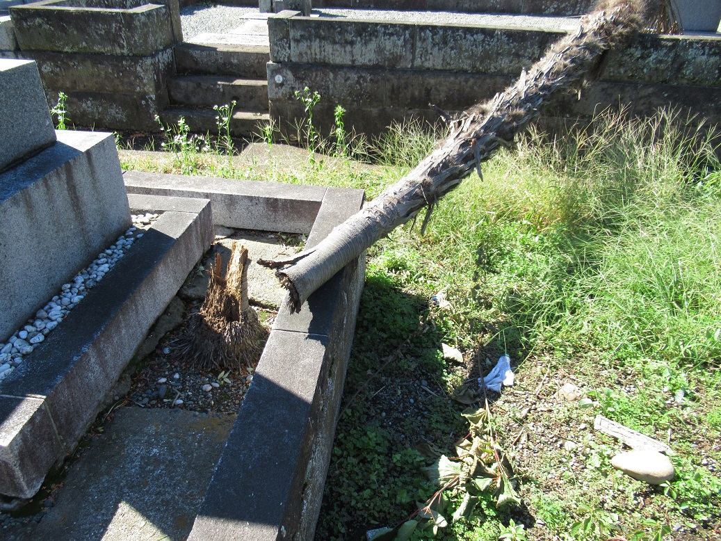 台風が過ぎ去った後の多磨霊園は、至るところに折れた木々が散乱し、一部では通路をふさいでしまっております。