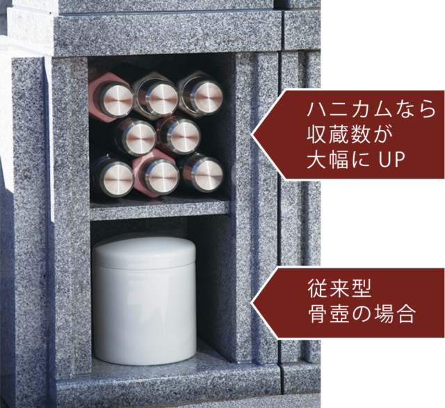 従来の7寸骨壺が置かれていたスペースに、「ハニカム」なら8本(8霊位分)も収納可能です。